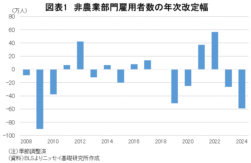 今回、CESでは2024年3月の非農業部門雇用者数が季節調整済で▲58.9万人下方修正された(図表1)。これは2009年以来で最大の改定幅である。また、ベンチマークの改定に伴い2024年1月から12月の雇用者数が下方修正された結果、2024年の月間平均雇用増加数は改定前の18.6万人から16.6万人に▲2万人下方修正された。