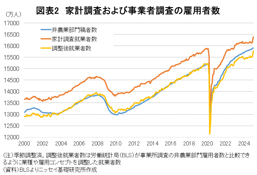 一方、昨年6月の本稿で指摘したように、ここ数年はCESとCPSで推計される雇用者数に大幅な乖離がみられていた。今回の年次改定ではCESが下方修正される一方、CPSが大幅に上方修正されたことで両者の乖離が縮小した。両者には元々対象年齢や対象業種、雇用概念などに差があり、単純な比較はできないが、BLSは比較可能とするためにCPSの就業者データをCESの基準に沿うように調整した調整後就業者数を発表している。実際にCESの非農業部門雇用者数とCPSの調整後就業者数の乖離幅は2024年12月の369万人から2025年1月には146万人に縮小した(図表2)。乖離の要因について、当初からCPSが移民人口の急増を反映できておらず、過小評価されているとの指摘が多かった。今回の修正はこれらの指摘が正しかったことを確認した。