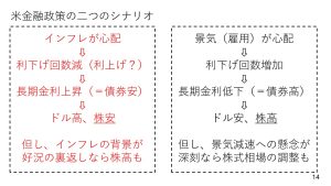 米国の金融政策には今後2つのシナリオが考えられます。一つは景気への心配から利下げが増加、長期金利が低下しドル安株高へというパターンです。もう一つはインフレへの心配から利下げ回数が減り、長期金利は上昇しドル高株安という連想につながるシナリオになります。