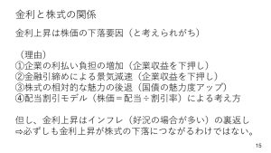 そもそも金利上昇は金融引き締めによる景気減速や企業の利払い負担増加などから株価の下落要因と考えられがちです。また、相対的に見れば、わざわざリスクを取って株に手を出さなくてもよい、という見方もあるでしょう。こうした理由から金利の上昇は株の下落要因であると言われます。