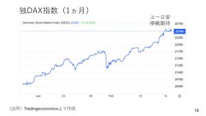 ヨーロッパでは、独DAX指数が史上最高値を更新しました。ユーロ安に端を発する輸出関連銘柄への期待感の高まりが要因だという声があります。また停戦への期待もあるようです。いずれにせよドイツ株は非常に堅調に推移しています。