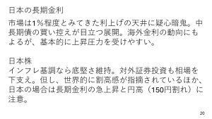 ただ、長期金利の急上昇やリスク回避的な動きから150円を割り込むような円高の動きが出てくる場面では株価も不安定な動きになる可能性もあり、要注意です。