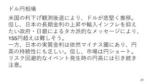 ほかにも高田審議員の発言にも注目ですね。今週の田村審議委員に続いて高田審議委員からも「金利は1%程度までしっかりあげていくのだ」という発言が改めて出るかがポイントになるでしょう。