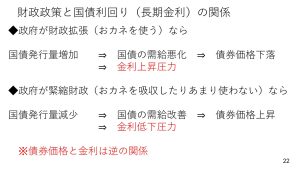 政府が大盤振る舞いでお金を使う話が前面に出る場合は国債をどんどん発行し、お金を調達しないとなりません。そうなると需要超える形で国債の発行量が増えるので、債券価格は下落します。一方で債券価格と金利は逆の関係にありますから、債券価格の下落は金利上昇圧力となります。またこれと真逆の動きをすると金利低下圧力となります。