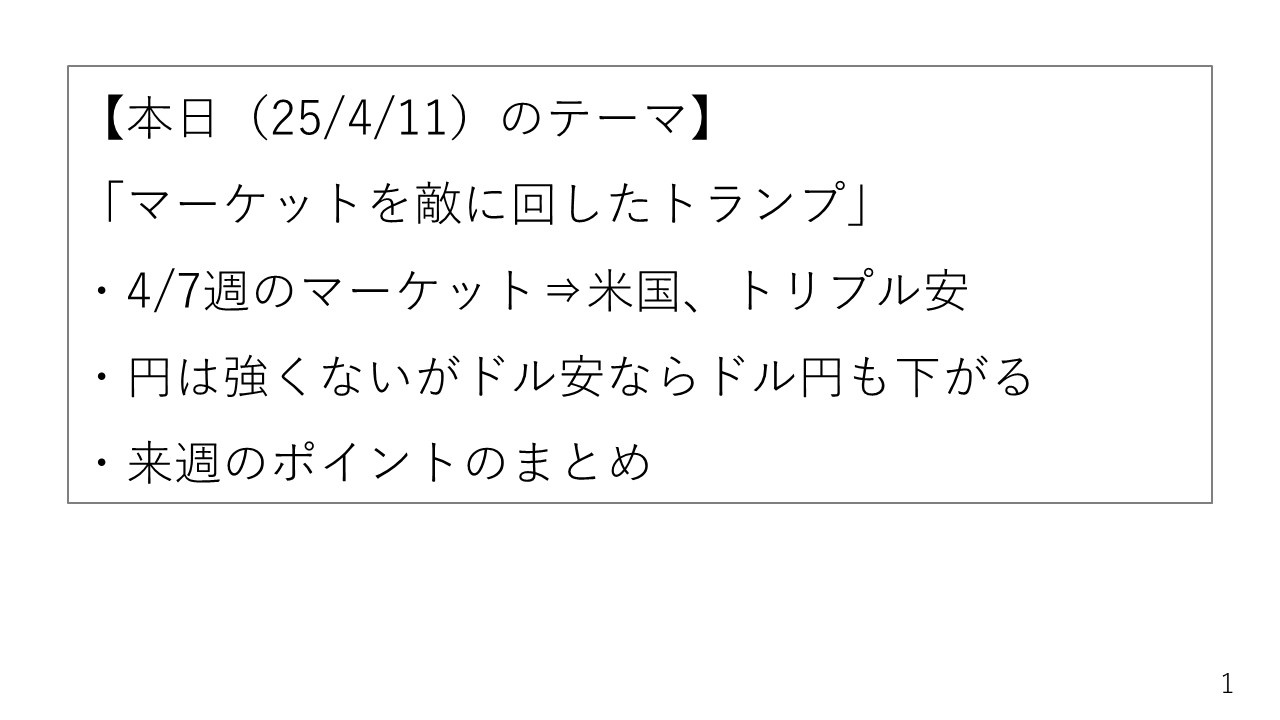 第26回のマーケットトークです。「マーケットを敵に回したトランプ」と題して4月7日週の話題についてお話したいと思います。