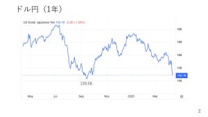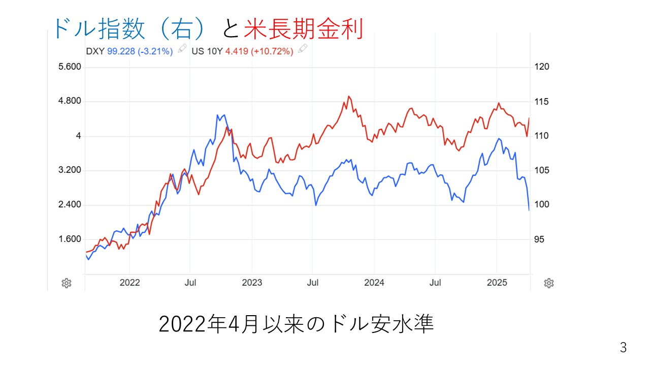 ところが図の右端の4月7日週のデータを見ますと一時4%を割った長期金利が4.5%台まで瞬間的に急上昇し、足元でも4.3から4.4%程度まで上がっています。一方のドル指数は2022年4月以来3年ぶりのドル安水準となっています。金利の上昇は債券相場の値下がりですから、4月7日の週の米国は株安・債券安・ドル安のトリプル安に見舞われました。