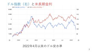 このほか2022年、トラス首相時のイギリスが財政の大盤振る舞いを打ち出した際、長期金利急上昇とポンド安が見られました。従って、悪い金利上昇が通貨安を招くのが本来の姿です。しかし、基軸通貨のドルに限ってはここ近年、悪い金利上昇であってもドル高という反応が出ていました。