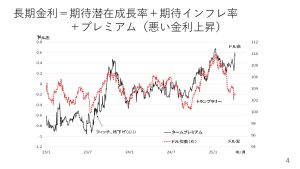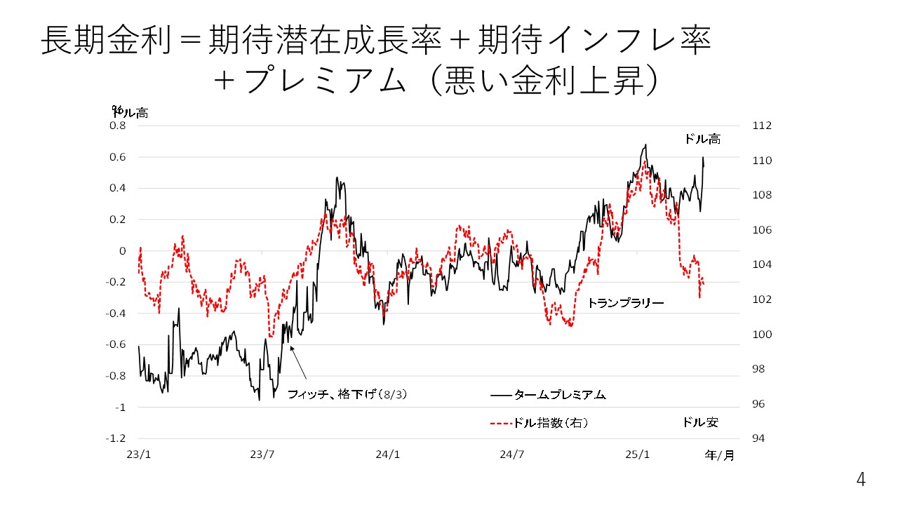 昨年の秋以降もトランプ大統領の帰り咲きを見越し、財政拡張が予想された局面で同様にタームプレミアムが拡大する悪い金利上昇にやはりドル高の反応でした。