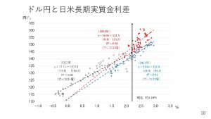 逆に2014年以降、アベノミクスによってインフレ期待が高まった場面では実質金利が下がったことから円安になりました。2022年以降も、まさにインフレが高まった結果、実質金利が大幅なマイナスとなって、未曽有の円安となったのです。