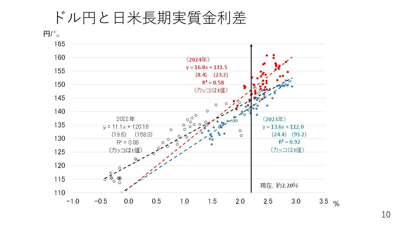 ここからドル円相場の水準をチェックします。現在、日米間の実質長期金利差は大体2.2%です。これに対応するドル円は大体140円付近から2024年のケースでいけば153円程度でもおかしくありません。ただ金利に関係なくドルが下がっていますから、この金利差という羅針盤はあまり当てにならないかもしれません。ですから140円割れも想定せざるを得ない状況です。