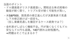 一番シンプルかつ楽観的なケースでいけば、悪材料手尽くし感によって米国の株安に歯止めがかかるかもしれません。そうなればトリプル安にも歯止めがかかり、ドル円も140円あたりで下値固めとなることが十分期待できます。ですが、現状ではそこで止まるかどうか非常に心配な時間帯が続くのではないかと見立てています。