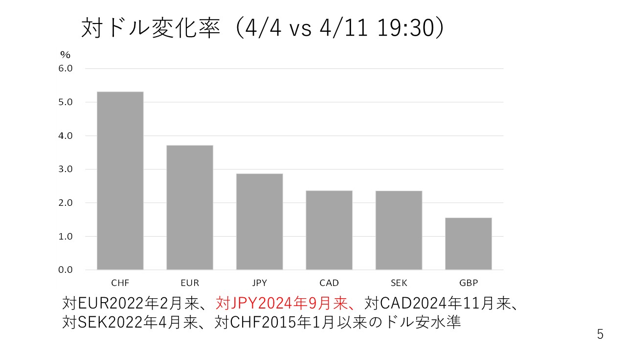 4月7日週のドル円相場は142円台まで下落しました。ここで4月4日の終わり値と4月11日、日本時間19時30分時点におけるドル指数を構成している6通貨の対ドル変化率を見てみます。6通貨全てが米ドルに対して上がっており、米ドルは全面安となる中、日本円は上から3番目です。