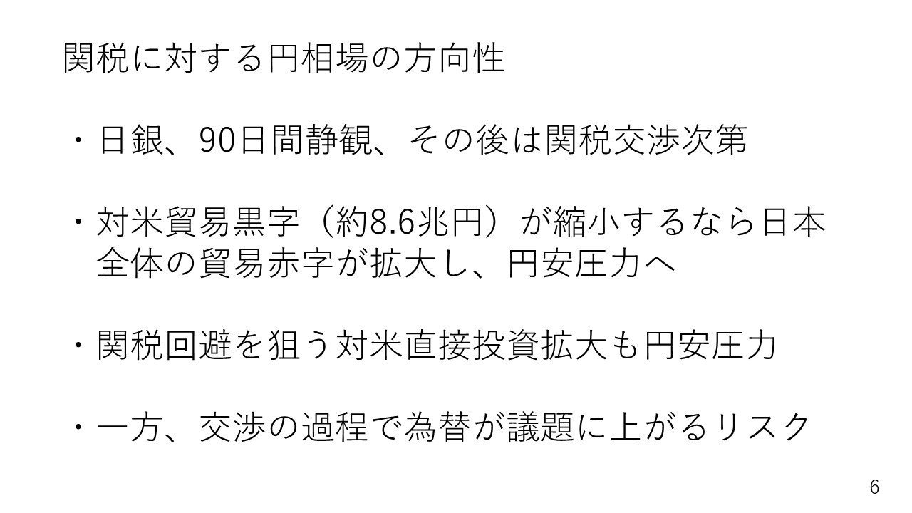 そして、90日間の後、7月の終わりに日銀会合がありますが、参議院選挙後です。日本の政治情勢がどうなっているかよくわからない状況である上、米国は早ければ夏場に利下げに入る可能性があります。さらに90日間の関税交渉がどのような結果に落ち着くかもわかりません。