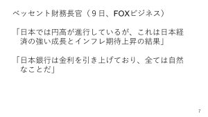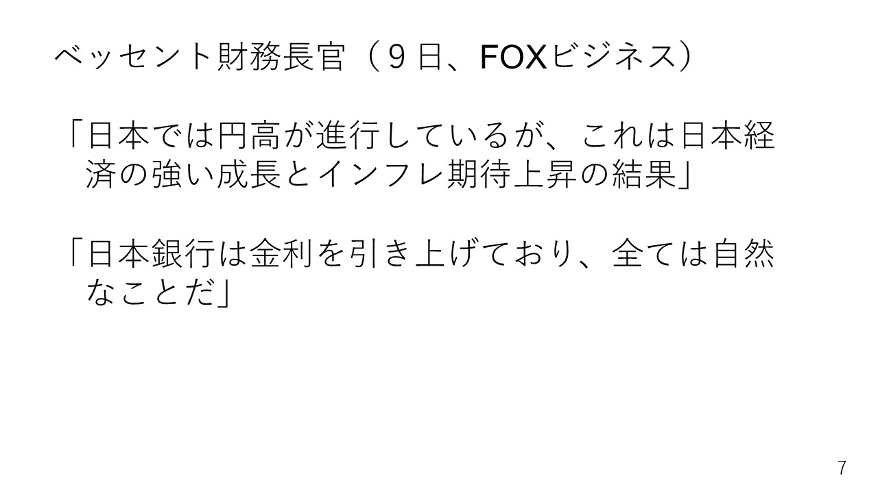 実際、4月9日、スコット・ベッセント米財務長官が、メディアに対して「日本では円高が進行しているが、これは日本経済の強い成長とインフレ期待上昇の結果」、そして「日本銀行は金利を引き上げており、全ては自然なことだ」と発言しています。