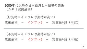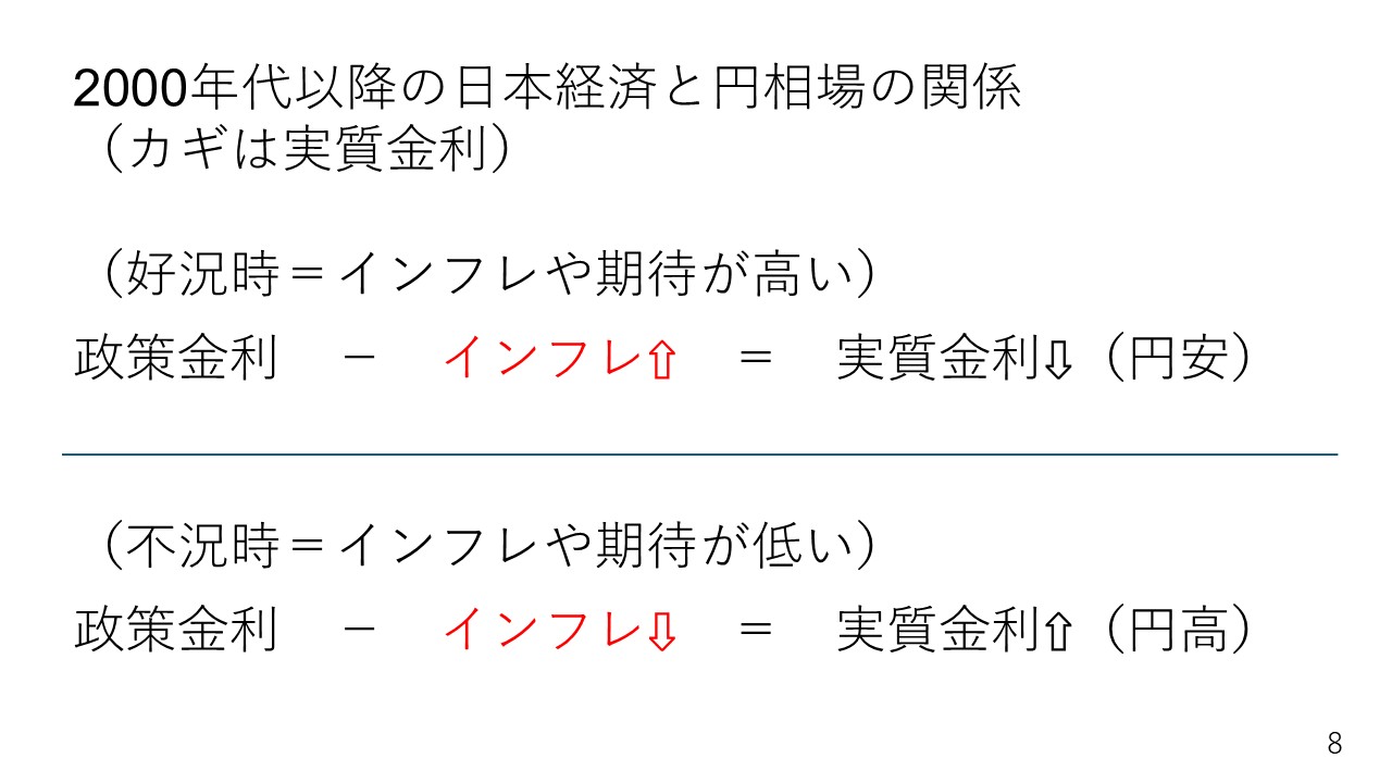 そもそも2000年代以降、日本経済と為替相場の関係性の鍵は実質金利が握っています。例えば、日本で景気が良くなり、インフレ率や期待インフレ率が上がると政策金利から期待インフレ率を差し引いて求められる実質金利が下がり、これが円安を招きます。逆に景気が悪い時は、インフレ期待が萎んでしまう結果、反対に実質金利は高くなり、これが円高をもたらします。