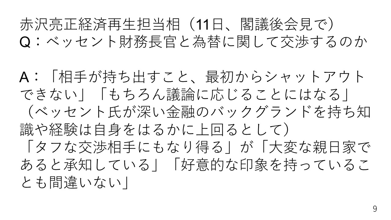 先に申し上げた通り、私から見ればベッセント氏は円相場の実態を全くわかっていません。しかも日本はこれまで、円安に誘導したことはなく、国内経済を目的とした金融緩和の結果であるとのスタンスを取ってきました。ですから赤澤経済再生担当大臣は為替に関していかなる要求も突っ張らないといけない立場であるはずですが、心もとない発言でした。円安是正を部分的に受けるかのようなことが間違ってもあってはいけませんが、少々心配です。