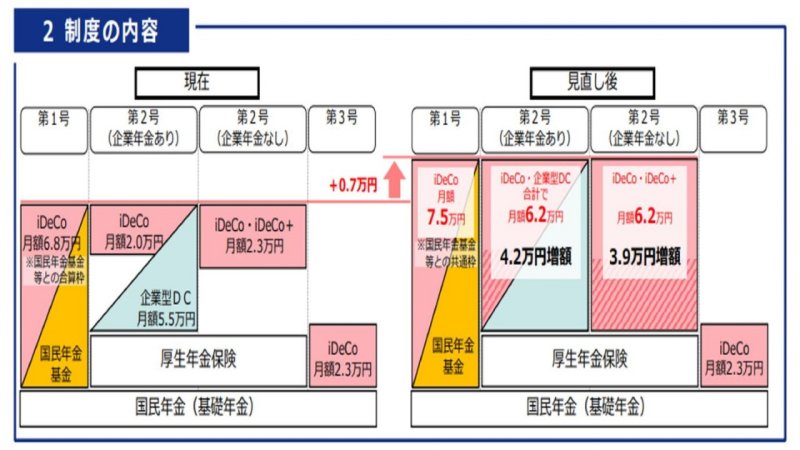 改正案が実現すると、第二号被保険者においては、企業型DCの拠出限度額が6.2万円に統一され、そこから会社拠出の企業年金掛金(DB掛金相当額、DC事業主掛金)を差し引いた範囲全額で、従業員の任意拠出(DC加入者掛金またはiDeCo掛金)が可能な穴埋め型となる。また、企業年金未加入の場合、月額6.2万円をiDeCoに拠出することも可能である。