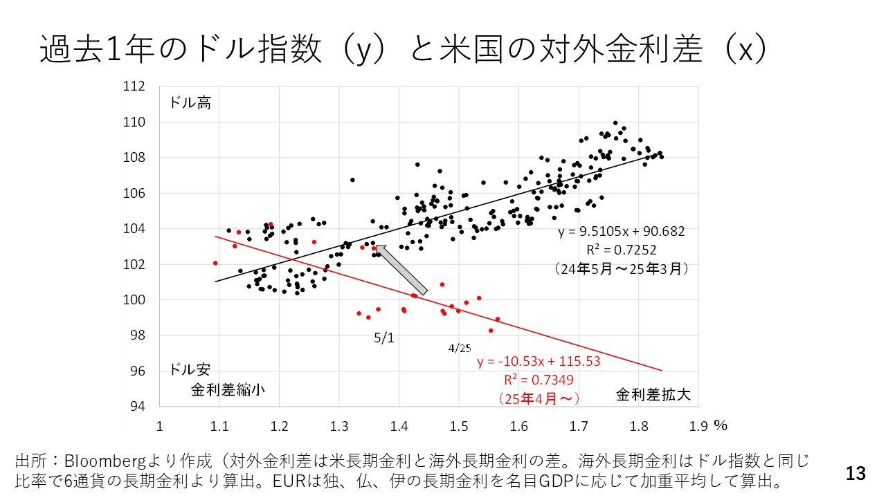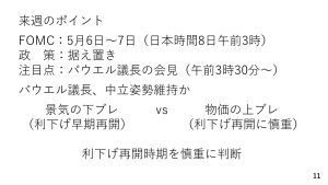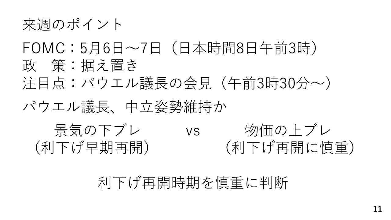 5月5日週の注目ポイントは現地時間6・7日に開催されるFOMCです。政策金利は据え置きでしょう。特に注目は日本時間8日午前3時半から始まるパウエル議長の記者会見です。パウエル議長は今まで利下げの再開は慎重に判断すべきと言っていました。関税の結果、景気の下振れが生じた場合、雇用の悪化につながり、早めの利下げ再開が求められます。一方、関税によってインフレの加速も懸念されます。その場合は利下げどころではありませんから利下げ再開には慎重な姿勢が維持されることになります。これまでパウエル議長は両睨みしつつ、利下げ再開時期を慎重に判断するとしており、このスタンスはおそらく5月のFOMCでも変わらないと思います。