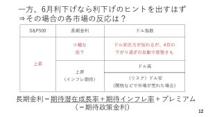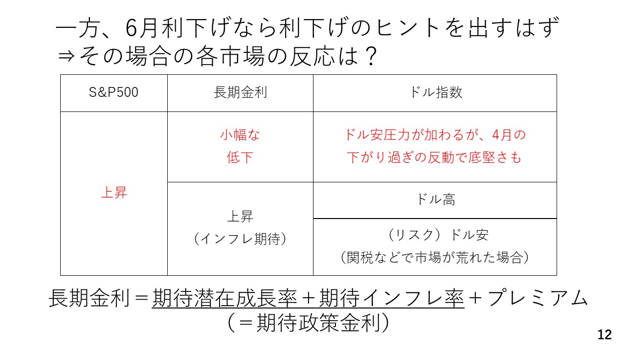 一方、利下げのヒントが出た場合、長期金利が上昇する可能性もあります。長期金利を構成する要素の一つが期待インフレ率です。関税が発動されたことからインフレが警戒される中市場が利下げを拙速とみればインフレ期待が上昇して長期金利が上がる可能性があります。