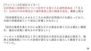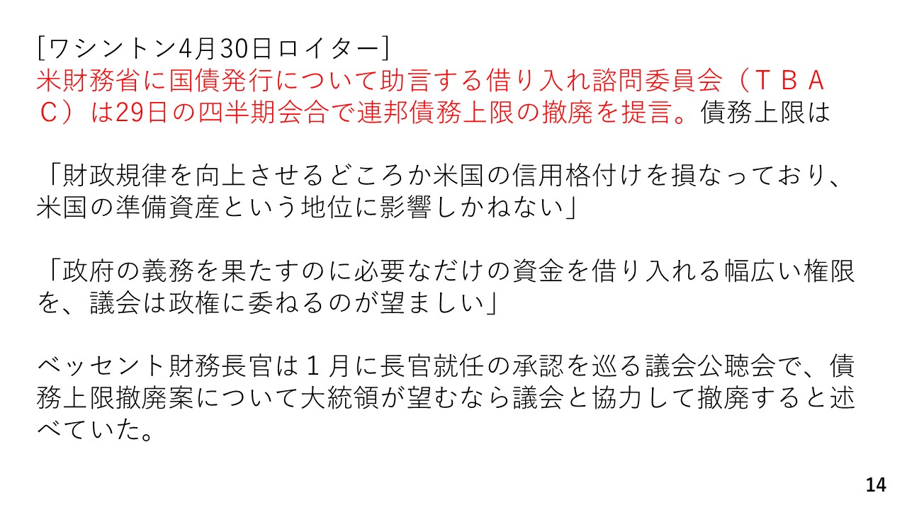 最後に気になったニュースを1つご紹介します。米国の国債発行について助言をする借り入れ諮問委員会が債務上限の撤廃を提言したというものです。