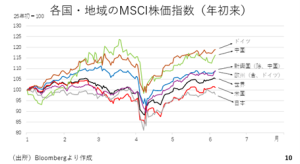 ただ、投機的な動きだけで為替相場が持続的に動くことは困難です。やはり、その持続性という点では、直接投資や証券投資といったリアルマネーの存在が重要です。そこで注目はやはり株式市場です。そこで、年始を100としてさまざまな国や地域のMSCI株価指数をみますと、ドイツのDAX株価指数が史上最高値を更新した通り、ドイツ株の値上がりが顕著です(10ページ)。欧州株全体としてみても1割ほど上がっており、やはり米国株から欧州株という資金の流れが示唆されます。このほか、中国や中国を除く新興国の株価も上がっており、近年みられた米国株のオーバーウェートが是正され、資金が分散して他地域へ流れている可能性が考えられます。