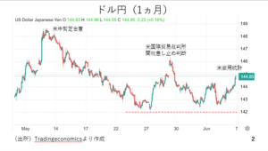 6月2日週(以下:今週)は、関税をめぐるリスク回避的な話題の多い一週間でした。トランプ大統領が鉄鋼やアルミニウム製品への関税を25%から50%に引き上げると発表しました。また、SNS上で「中国が合意を完全に破っている」と批判する一幕もありました。米国の経済指標でも製造業、非製造業のISM景況感指数やADP雇用報告が予想を下回りました。一方、足元では雇用統計の発表を受け、145円付近までドル高円安となっています。今週のドル円は142円付近では底堅く、良い材料にはドル高の反応がみられるなど、やや「上がりたがっている相場」のように見受けられます(2ページ)。