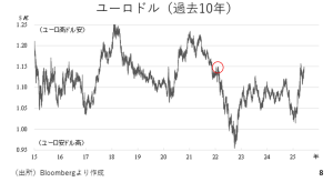 では、過去10年間のユーロドル相場をみてみましょう。上がユーロ高ドル安、下がユーロ安ドル高です。2021年辺りがユーロの高値、ドルの安値です。2022年以降、ECB(欧州中央銀行)も利上げをしましたが、それ以上にFRBが利上げを進めた結果、ユーロ安ドル高が進みました。その後、現在の1.15近辺までユーロが反発してきた状況です(8ページ)。この1.15は2021年以降、ユーロ安が進んだ後の戻りを阻まれ、その後大きくユーロ安が進んだことから、節目のポイントでもあります。従って、ここからユーロドルが1.15を超えて上昇する場合、さらにユーロ高に弾みがつくと考えられ、注目です。仮に、1.15を超えて1.20や1.25まで行くような大相場となる場合、ドル安も続くことになり、ドル安の持続性を見る上で重要なポイントになってくると考えられます。