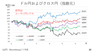 一方、仮にドルが続落した場合、ドル円はどうなるでしょうか。ドル円とクロス円をみますと、ドル円は現在、年初比で9%ほどドル安円高です。ただ、クロス円を見ていきますとスウェーデンクローナ円、ユーロ円、スイス円の3つは年初よりも円安です。ポンド円は年初とだいたい同水準です。この為、明確に円高になっているのはドル円とカナダ円だけです。円が非常に強いかといえばそうではありません。ドル円が9%下落している要因の多くもドル安が効いていることにあります。ドルが下がる場合、ドル円も連れ安になる可能性がありますが、他のクロス円に支えられ、ずるずると下がり続ける状況にはなりにくいと考えています(10ページ)。