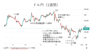 その上で生産者物価指数(PPI)の伸びも前月比で0.1%と発表されました。このペースが続けば1年で1.2%程度しか物価が上がらないという水準で、インフレが非常に弱いということになります。この結果、ドルは143円台前半まで下落しました。また、13日の早朝にイスラエルが実際にイランを攻撃しました。そこからリスク回避の円買いが連想され、142円80銭付近までドル安円高が進みました。その後、多少持ち直して現在144円台を回復した状況です。
