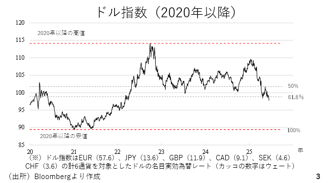 改めてドル指数を見ますと、2020年以後の高値からの半値押しを下抜けし、さらに61.8%押しである98付近も下抜けしてきた状態です。ここを抜けると全戻しが警戒されます。その場合のドル指数は89付近で、仮にそこまでドルが下がるとすれば現状からさらに約8~9%ぐらいドル安が進む計算です(3ページ)。