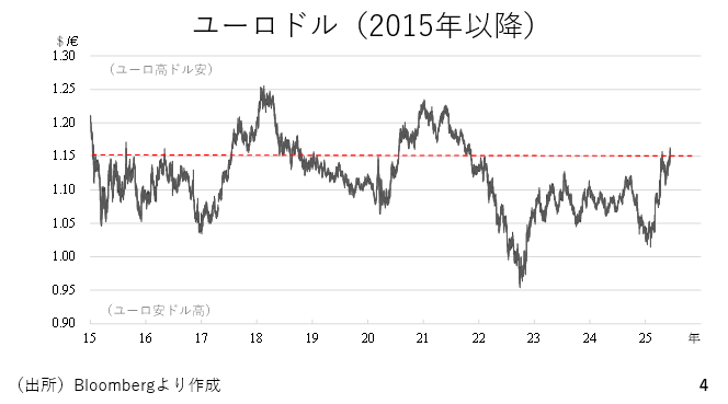 そこで重要になってくるのがドル指数を計算する際に約57.6%と最もウェートが高いユーロの動きです。ユーロドルについては先週も1.15を巡る攻防に注目とお伝えしました。今週は後半にかけて1.16台乗せもみられました。このユーロドルの1.15の上抜けがドルを圧迫している状況です(4ページ)。