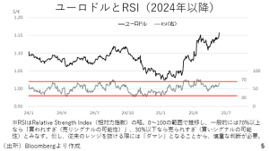 次に2024年以後のユーロドルのチャートと相対力指数(RSI)をみてみましょう。RSIとは「売られすぎ」や「買われすぎ」を示すオシレーター系のチャートです。右側の縦軸の70%を超えてくると買われすぎ、即ち売りシグナル、逆に30%を下回ってくると売られすぎ、つまり買いシグナル点灯ということになります。