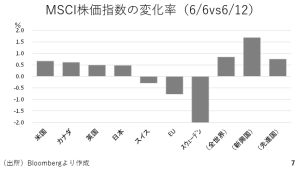 次にMSCI株価指数を見てみましょう。ドル指数を構成する6カ国と米国に加えて参考までに全世界と新興国、先進国の株価の変化も先週金曜日と12日(木)の終わり値と比較しています。ここでも米国債同様、米国株がわずかな差ではありますが、一番上がっています。以上からドル資産離れは既に一巡しており、為替のドルだけがいつまでも売られ続けるわけではないと考えられます(7ページ)。