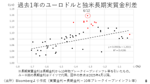 そこで改めてユーロドルと金利差を見てみましょう。過去1年間のユーロドル相場を縦軸、長期実質金利差を横軸にとっています。ここでいう長期実質金利差は、長期金利から10年物ブレイクイーブンインフレ率を引いた実質金利の差です。ユーロ圏の長期金利はドイツのものを代用しています。