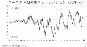 さらに2000年以後のユーロの先物市場におけるネットポジションも確認しましょう。現状ではユーロロングが約9万枚です。引き続き債券市場ではドル離れがテーマになっている模様で、その受け皿としてユーロが選好されているのでしょう。過去には20万枚前後までユーロロングが積み上がった実績もあります。ここからさらにユーロロングが積み上がり、ユーロドルが1.17、場合によっては1.18まで上昇し、ドル指数を90方向まで押し下げていくという可能性も残ります。ただここまで見た通り、株や債券の市場では既にドル資産売りが逆転しています。ユーロドルの上昇もそろそろ息切れしてくる頃合いと考えられます(9ページ)。