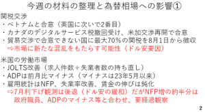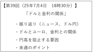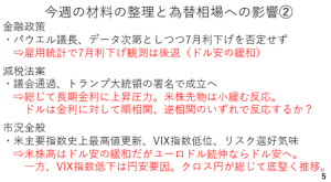 しかし問題は、4日になってトランプ大統領が、貿易交渉で合意できない国に対して最大で70%の関税を8月1日から課すことを表明したことです。交渉が間近な国は10%か20%、合意に遠い国に対しては60%か70%の税率とされ、これは為替市場に新たな混乱をもたらす可能性があり、ドル安要因となります。