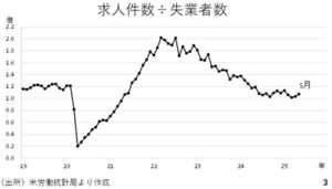 米国の労働市場については、雇用動態調査(JOLTS)が発表されました。求人件数を失業者数で割った値が持ち直しました。