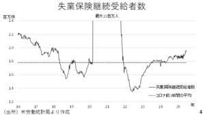 この雇用統計の発表前、7月の利下げ織り込みは約24%でしたが、雇用統計を受けて7月利下げの可能性は5%まで後退しました。これでおそらく7月の利下げはほぼなくなったと思います。ただし、非農業部門雇用者数増加の約半分が政府職員であり、ADPではマイナスでしたので、労働市場は悪化しつつあると考えられます。失業保険継続受給者数を見ると、コロナ前の3年間平均では約180万件弱でしたが、現在は200万件に迫る動きとなっています。職を離れている期間が長くなればなるほど再就職が難しくなりますので、このデータは米国の労働市場が弱くなっていることを示唆しています。