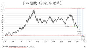 2021年以降のドル指数のレンジの上から見た61.8%押しが約98でしたが、今週は96までドル安が進み、61.8%押しを明確に下抜けしました。チャート的には半値押しの次の節目がこの61.8%です。その次に76.4%押しもありますが、経験則上、ここはサポートとしては弱いことが多い為、ドルについては全戻し、つまり元々の安値である90をわずかに割ったぐらいの水準まで、あと数%ドル安が進む可能性を念頭に置く必要があります。