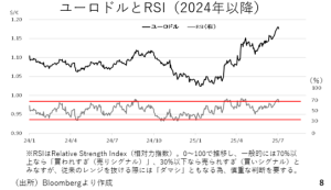 その際、ドル指数の約6割を占めるユーロドル相場が重要です。以前からお伝えしていた1.15の攻防は明確に抜けており、今週は1.18台に乗せる場面がありました。RSI(相対力指数)は70%を超えてユーロが買われすぎ、即ち売りシグナルが点灯していますが、例えばユーロドルが1.2や1.25に向かう大相場である場合、この買われすぎシグナルが点灯したまま相場が上昇していく可能性もあります。