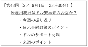 それでは最後に8/4週の主な予定やポイントを見て行きましょう。8/4週はISM非製造業景気指数を除き、日米で目立った経済指標は発表されませんが、日米の国債入札に注目です。日本では先述した通り、長期金利の上昇が「悪い金利上昇」とみられているのか、入札結果に注目です。一方、米国では7月4日に大型の減税法案が成立した後、すでに長期国債、超長期国債の入札をいずれも無難に通過していますが、そうした状況が変わっていないのか、注目です。
