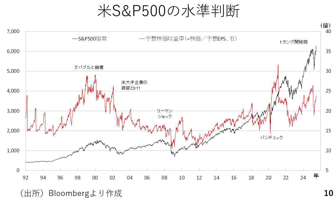 現在、S&P500株価指数は最高値圏にありますが、予想株価収益率を見る限り、必ずしもバブルといった状況にはありません。その上、利下げ観測を支えに底堅く推移すると考えられます。米国の個人消費は株式相場上昇による資産効果が強い追い風となる為、この株価の値動きも米経済に対する前向きな材料と見ることができます(10ページ)。