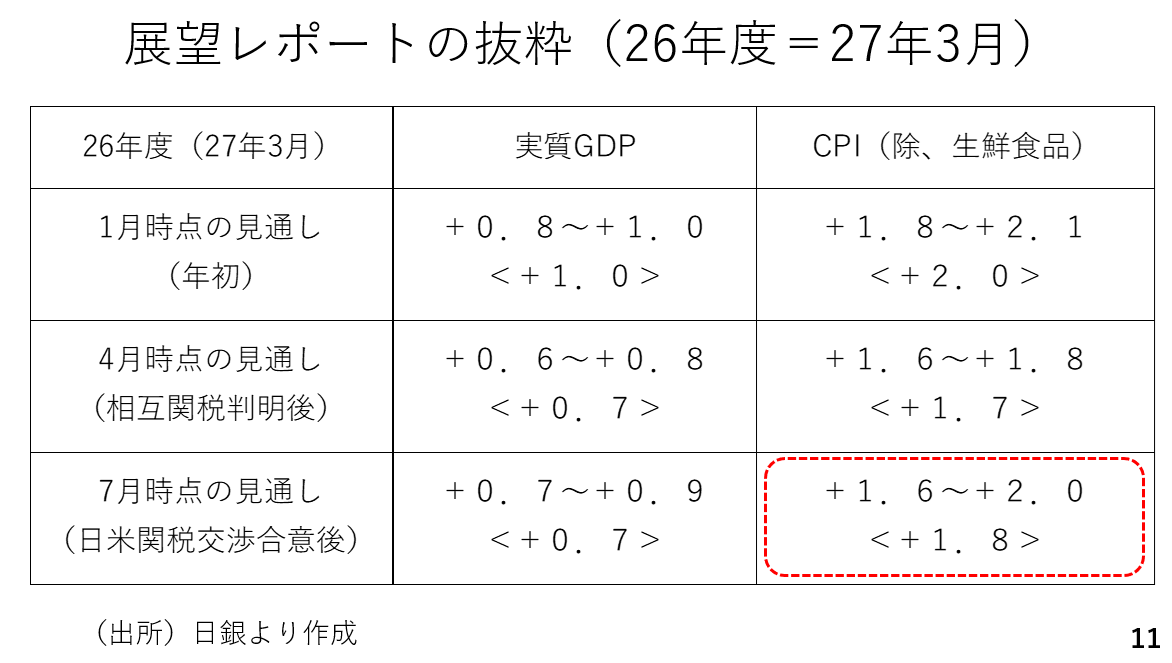 ここから日本や円の状況を見てみましょう。11ページの図表は最新の物価に関する展望レポートから一部抜粋したものです。この内、消費者物価指数の見通しを見ると1月時点においては2026年度末にかけて2%の物価安定目標の達成に対する自信が示されていました。