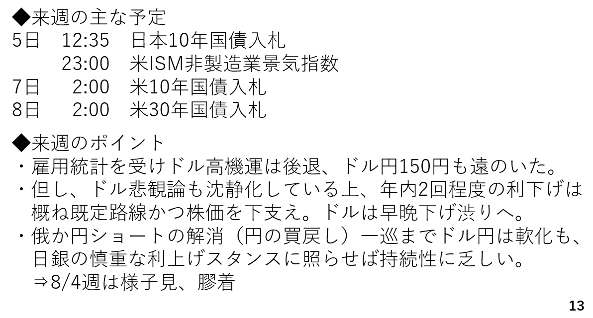 最後に8/4週のポイントです。今回の雇用統計を受け、ドル高機運はかなり後退しました。ドル円の150円も遠のきました。ただし春先にトリプル安としてドルやドル建て資産が悲観視された局面ではありません。年内2回の利下げであれば概ね既定路線とも言え、寧ろ株価を下支えすると考えられます。この為、ドルは次第に下げ渋りに転じていくと考えられます。ドル円についてはしばらくの間、FOMCや日銀の会合後に積み上がったドル買い円売りポジションの解消、即ち円の買い戻しが一巡するまで軟化しやすいと考えられます。但し、慎重に正常化を進めようとしている日銀の利上げスタンスに照らせば、円高が続く状況でもありません。以上を踏まえると8月4日の週のドル円は、1日のニューヨーク市場の終値近辺でやや様子見になると予想しています。