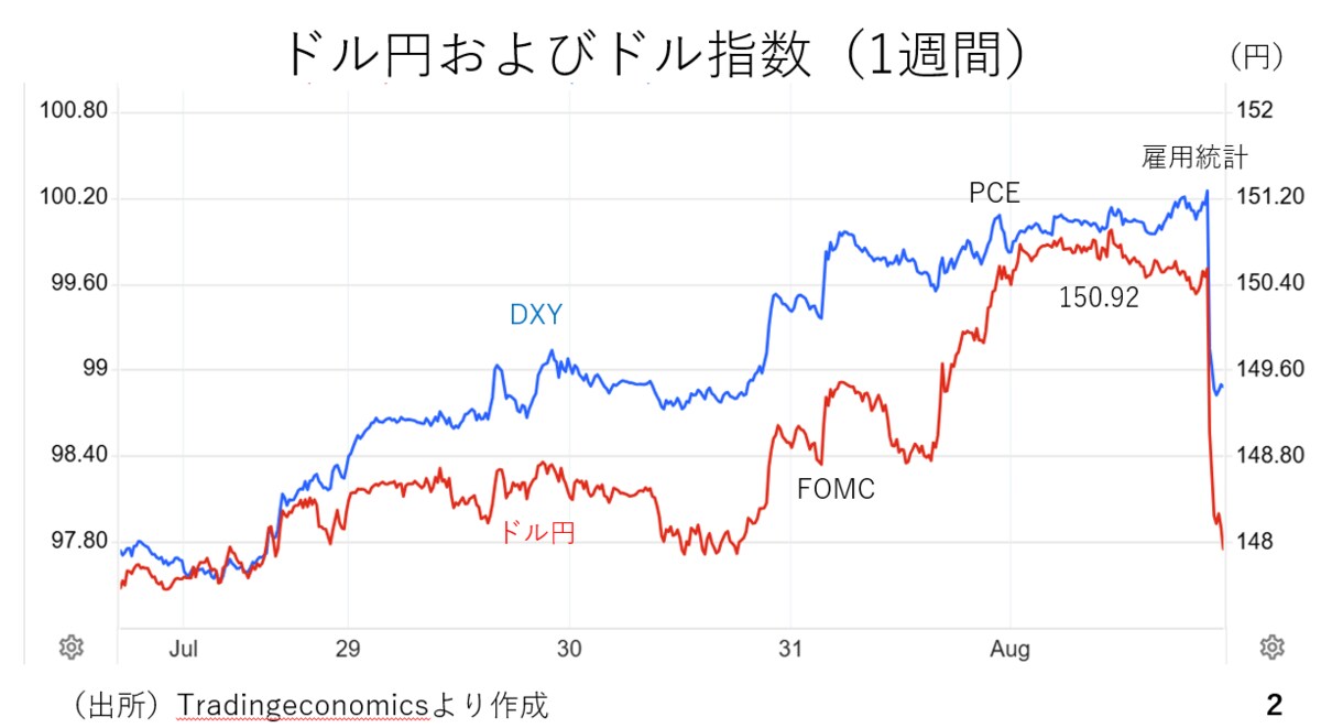 はじめに今週のドル円及びドル指数の動きを振り返っておきましょう。今週は週初より総じてドルが底堅く推移しました。そしてFOMCは予想通り政策金利を据え置きましたが、パウエル議長が9月の利下げのヒントを出さなかったことから、市場での利下げ期待が後退し、ドル高が勢いづきました。また、翌日の個人消費支出物価指数(PCE)の前年比の伸びが予想を上回ったことなどからドルが続伸し、150円台を回復しています。ただ本日の雇用統計を受けてドル円、ドル指数ともに急反落し、先ほどのISMを受けて147円台半ばまで下げ幅が広がりました(2ページ)。