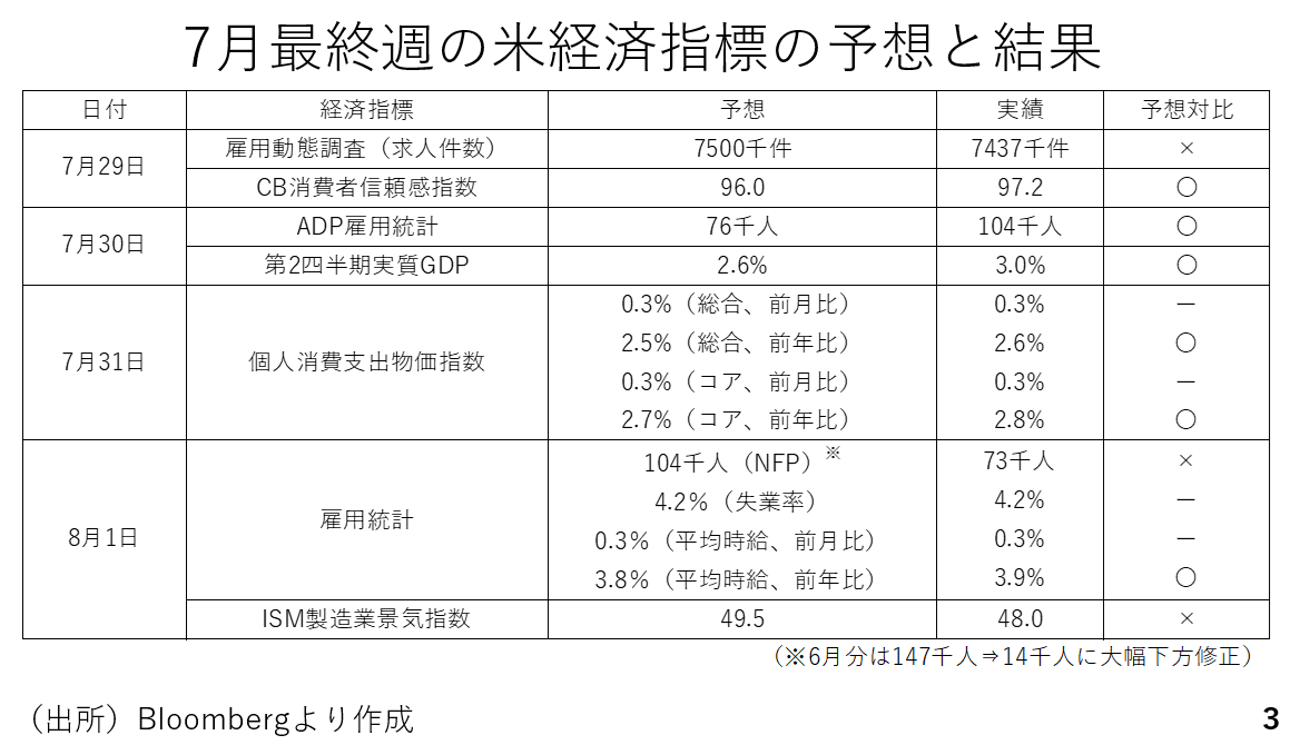 今週の主な米国の経済指標を振り返ります。週初の雇用動態調査いわゆるJOLTの一つ、求人件数が予想を下回りました。このため3ページの予想対比の欄にバツ印をつけています。一方、その後の経済指標は総じて予想を上回りました。先週の動画ではドル円の150円台回復にはドル高材料と円安材料がそれぞれ必要であると指摘しましたが、今週の雇用統計前まではまさに経済指標が利下げ観測の後退を通じてドル高を招く結果となりました。