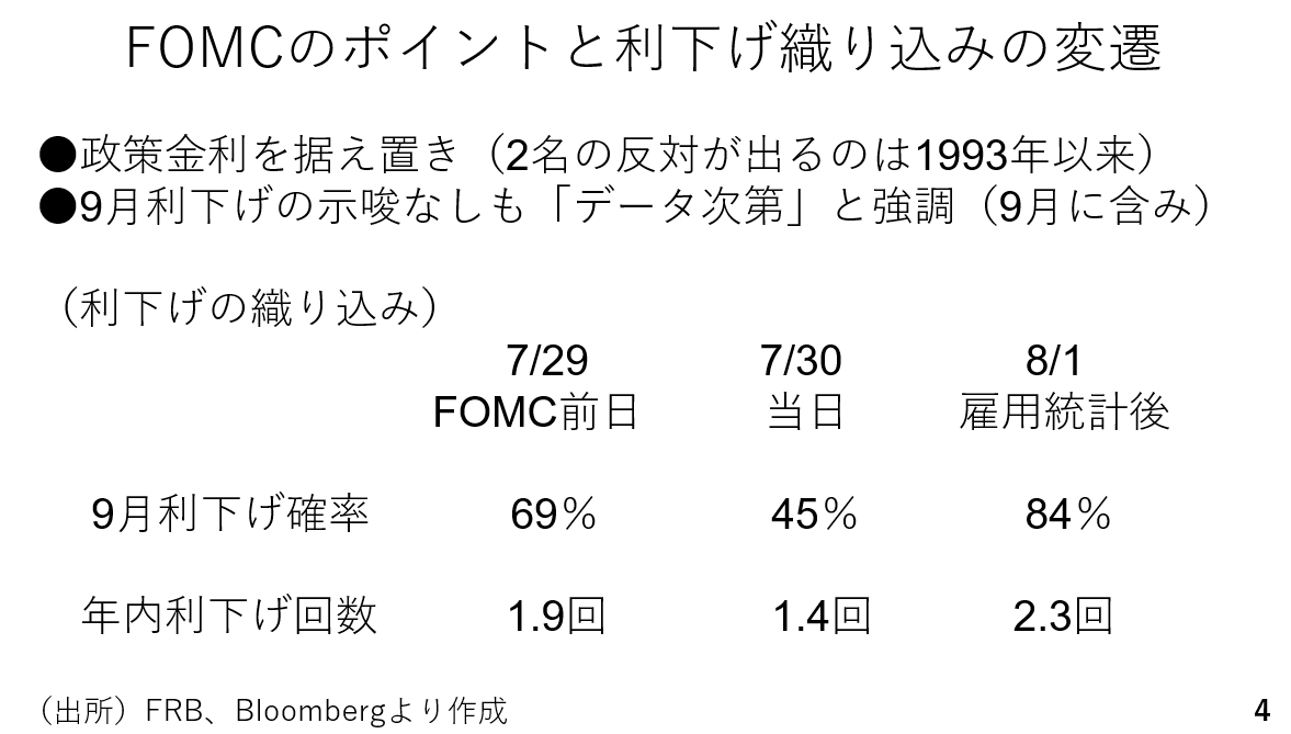例えば、FOMC前日における9月の利下げ確率は69%でしたが、FOMC後に45%まで低下。年内の利下げ回数についても同様に1.9回から1.4回まで低下しました。ところが雇用統計、それぞれ84%、2.3回まで増加しています(4ページ)。