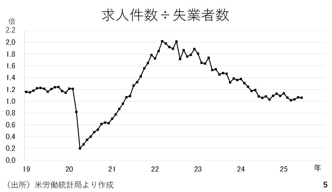 米国の労働市場に関して、これまでにもご紹介した事のある指標をみておきましょう。求人件数が失業者の何倍あるのかを示すものです。2022年には2倍でしたがその後、低下トレンドが続いており、労働市場が緩やかな減速傾向にあることがわかります。今回の雇用統計も踏まえると9月の利下げの可能性が高くなったと考えられます(5ページ)。