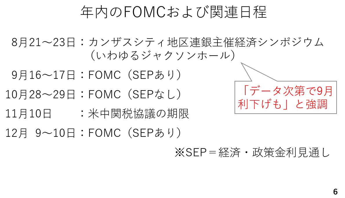 今後のFOMCに関連する日程も確認しておきましょう。8月21日から23日にかけてカンザスシティー地区連銀が経済シンポジウムを開催します。開催場所にちなんでいわゆるジャクソンホールと呼ばれるイベントです。ここでパウエル議長が9月の利下げに向けてどのようなメッセージを出すのか注目です(6ページ)。