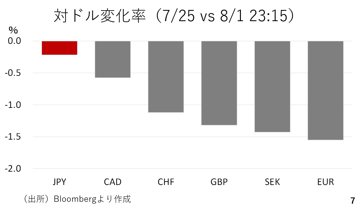 ここから為替相場を少し詳しく見て行きましょう。今週、ドル指数の対象となっている6つの通貨の対ドル変化率を見ますと、先ほど23時15分の時点でもまだ週初に比べ、ドルが全面高の状態を維持しています。いずれの通貨も対ドルで下落しているわけですが、この内、円の下げ幅が最も低く、相対的にみて円がやや強かったと見ることができます。もっともこれはFOMCや日銀の金融政策決定会合を見た後にドル買い円売りポジションが構築されたものの、雇用統計後にその解消による円の買戻しが活発化した為であって、必ずしも円が強くなったということではないと考えられます(7ページ)。